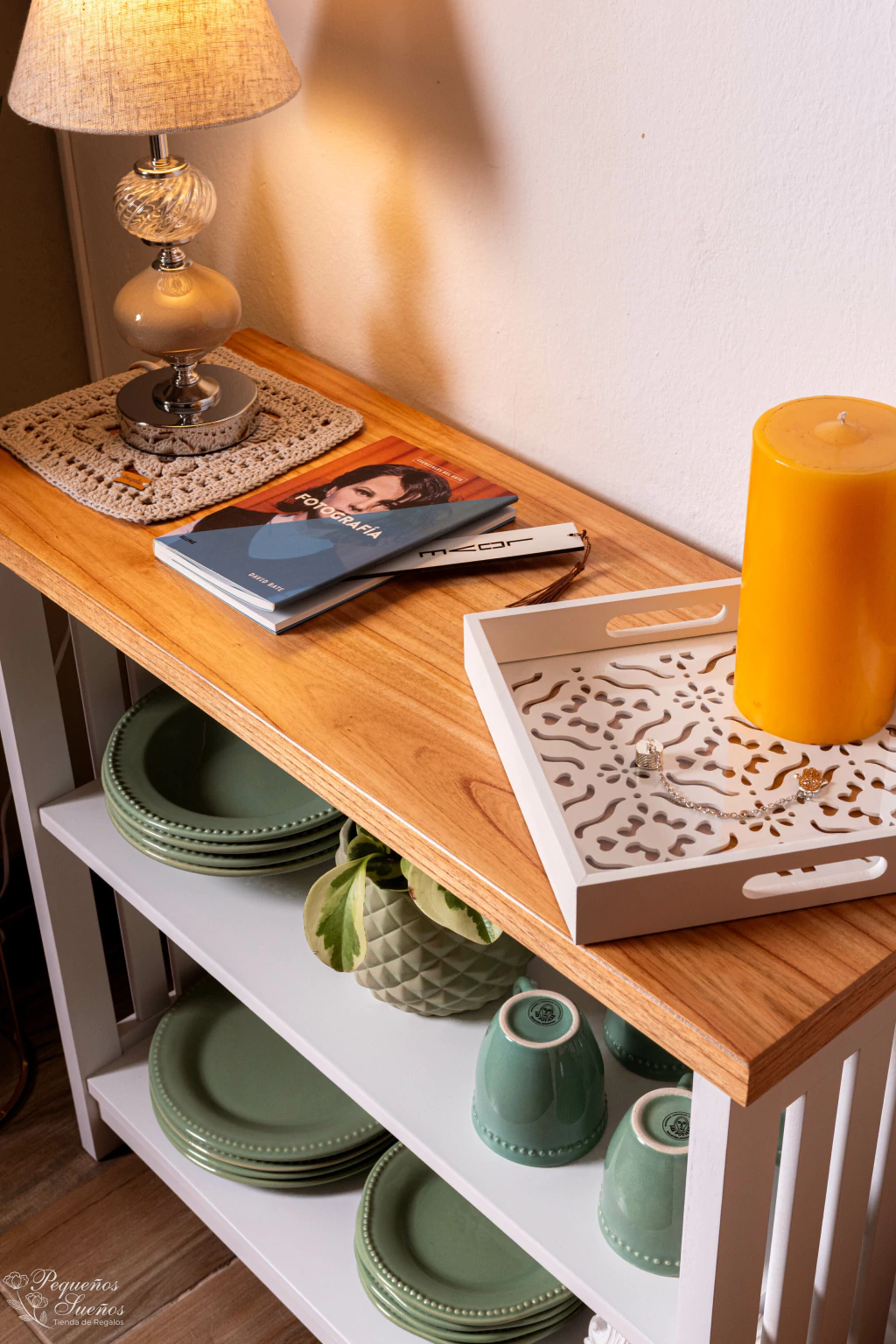 Mesa pequeña con estante. También puede utilizarse como biblioteca.